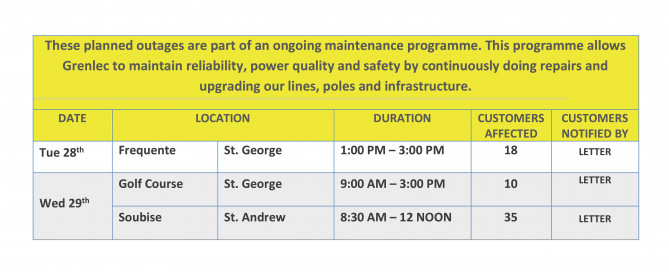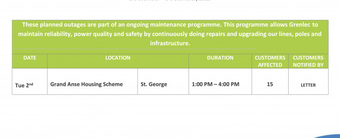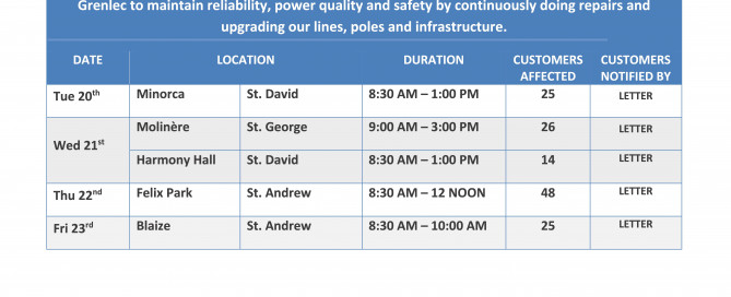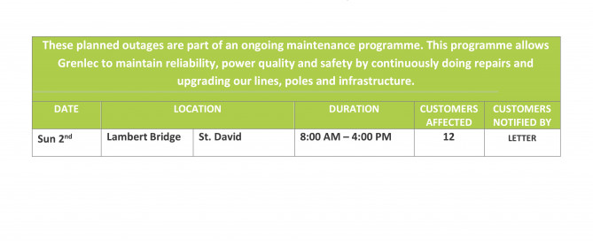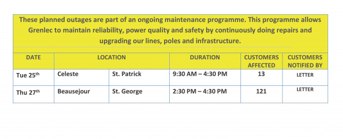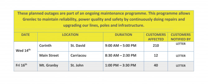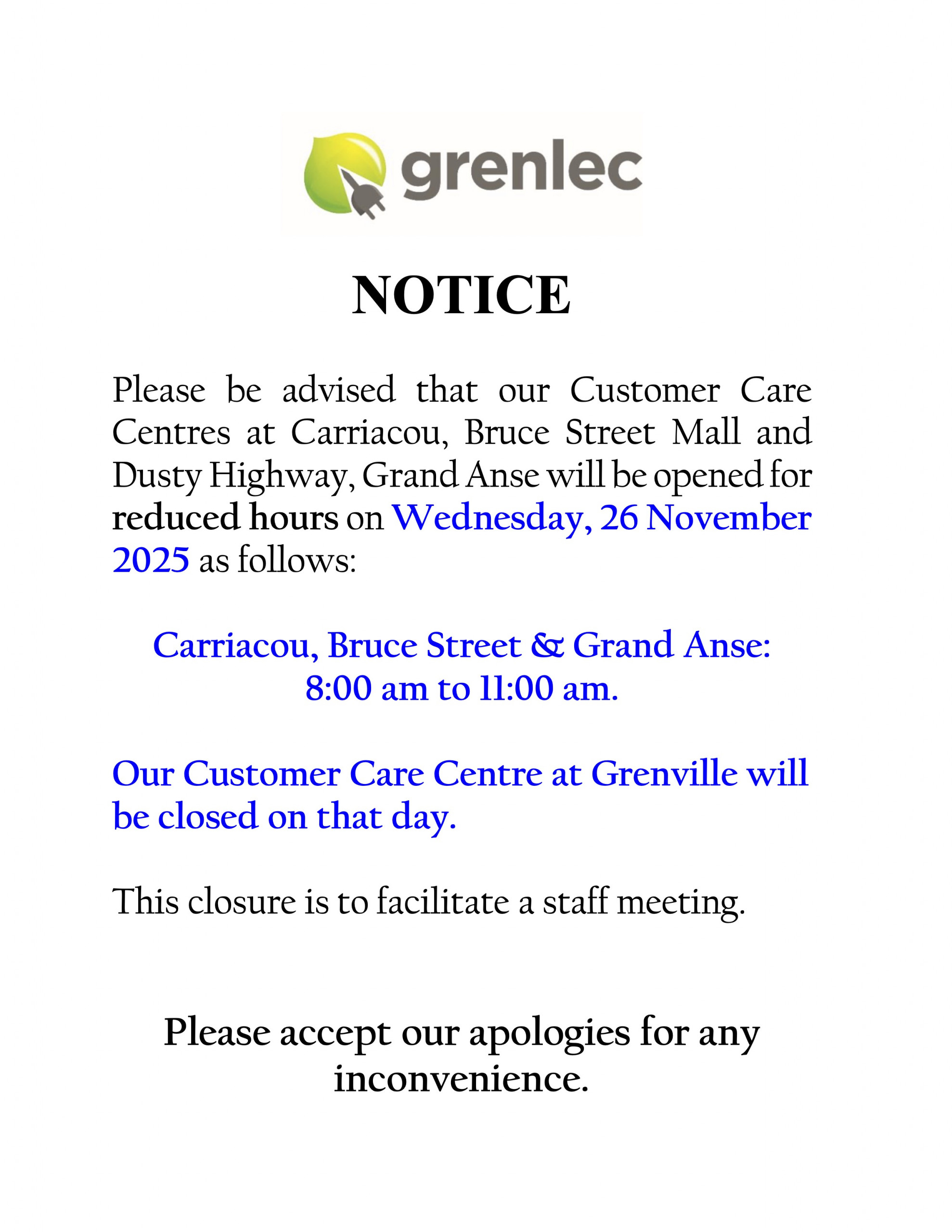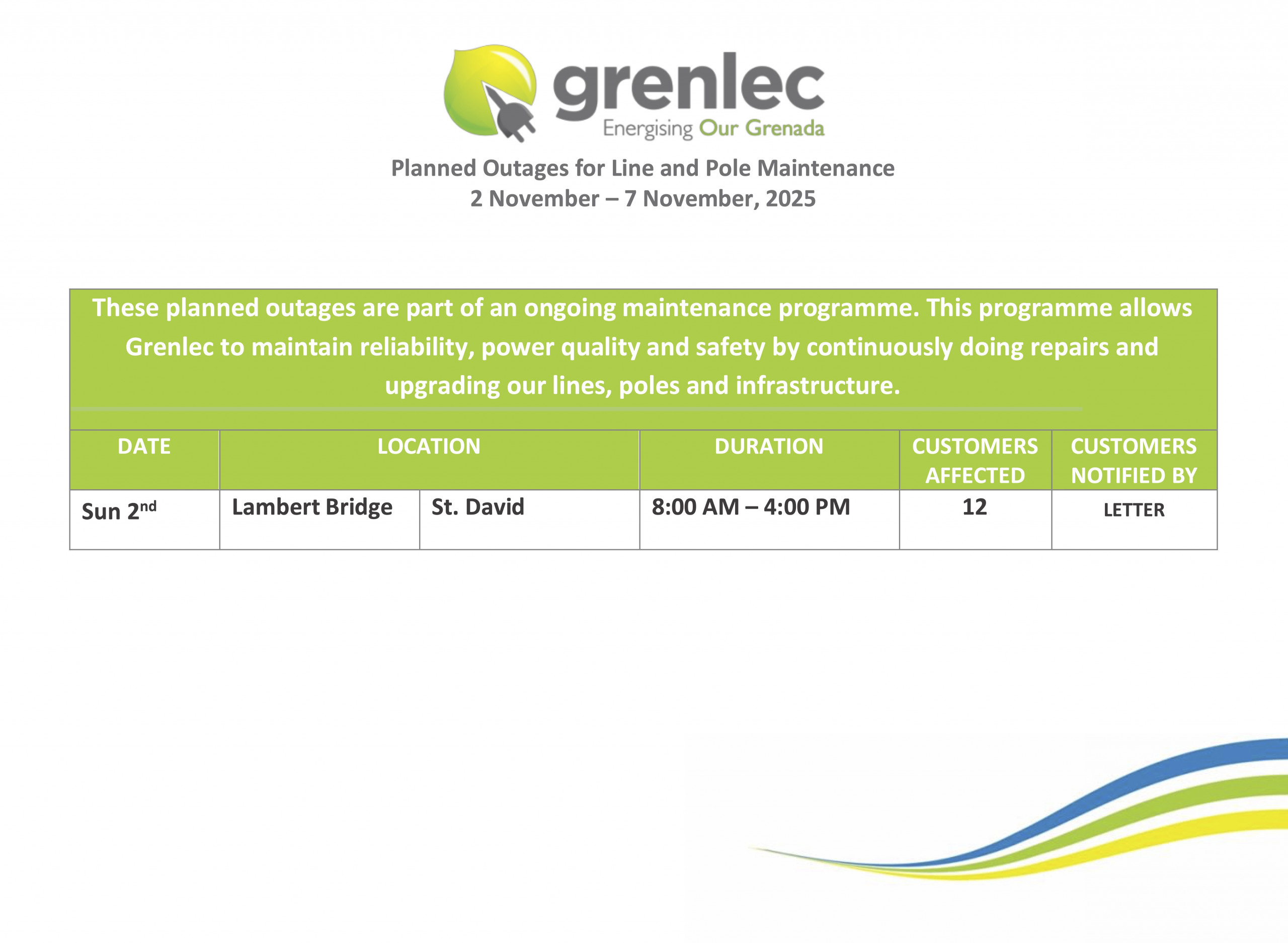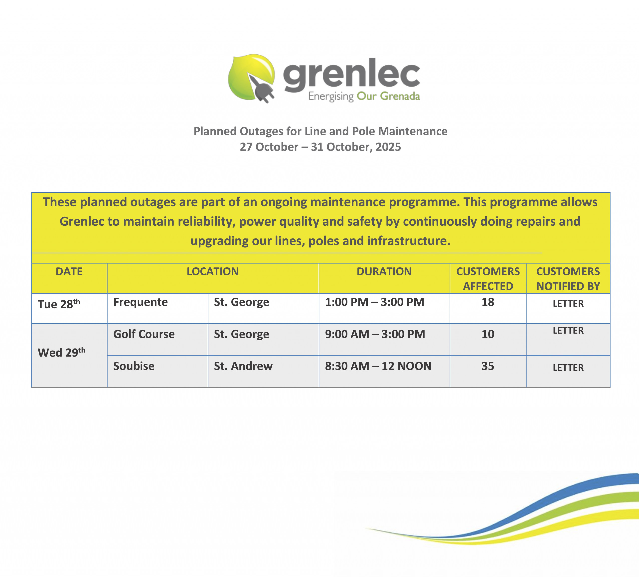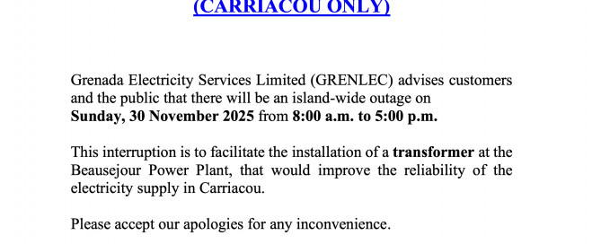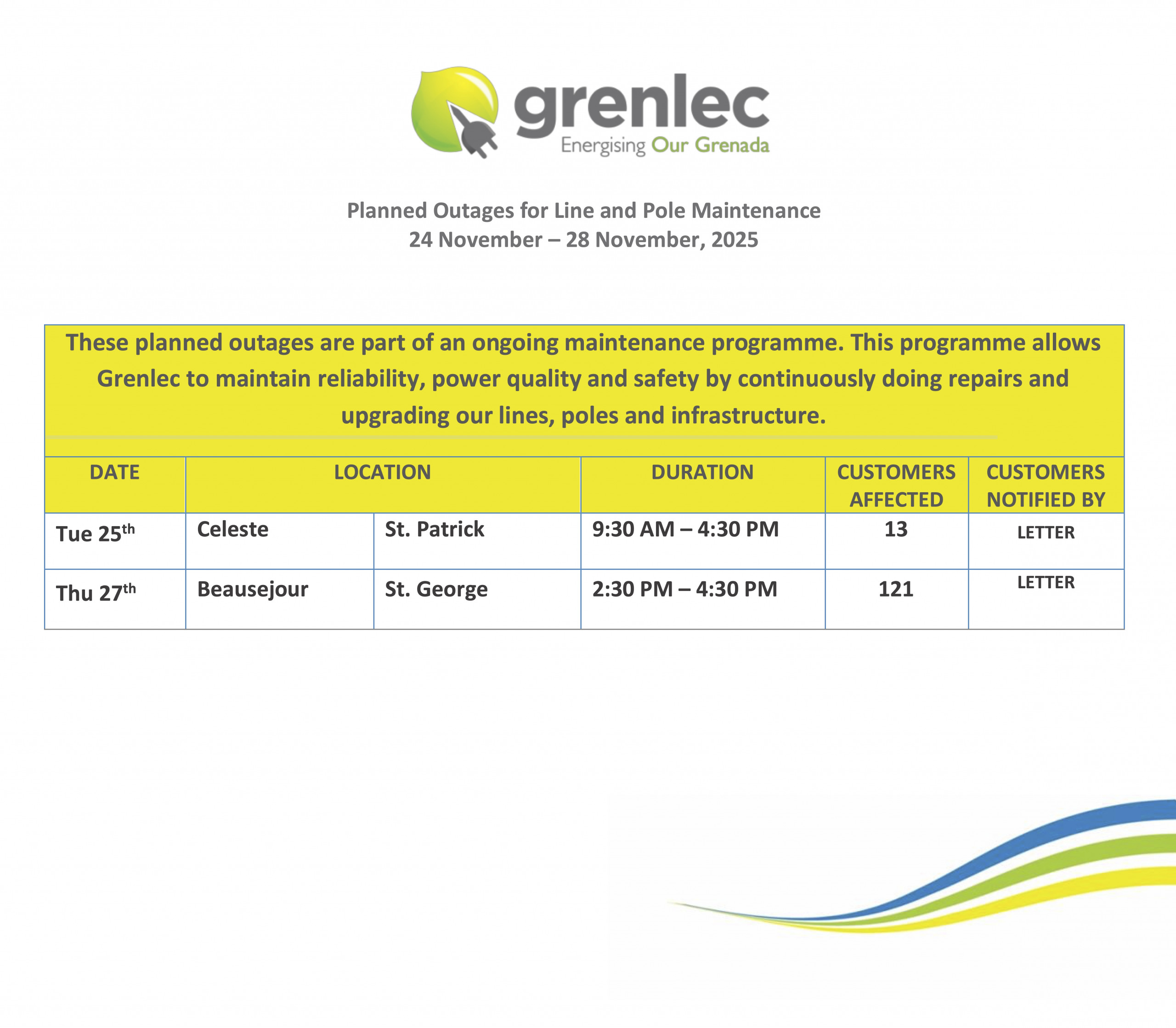 Customers in Carriacou will soon benefit from a stronger and more reliable electricity supply as Grenlec undertakes a major upgrade to the South Feeder on Sunday, 30 November 2025.To complete this work safely, an island-wide outage, in Carriacou only, will be required from 8:00 a.m. to 5:00 p.m.The upgrade is being driven by a