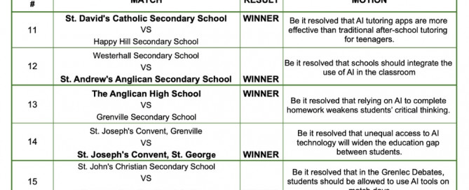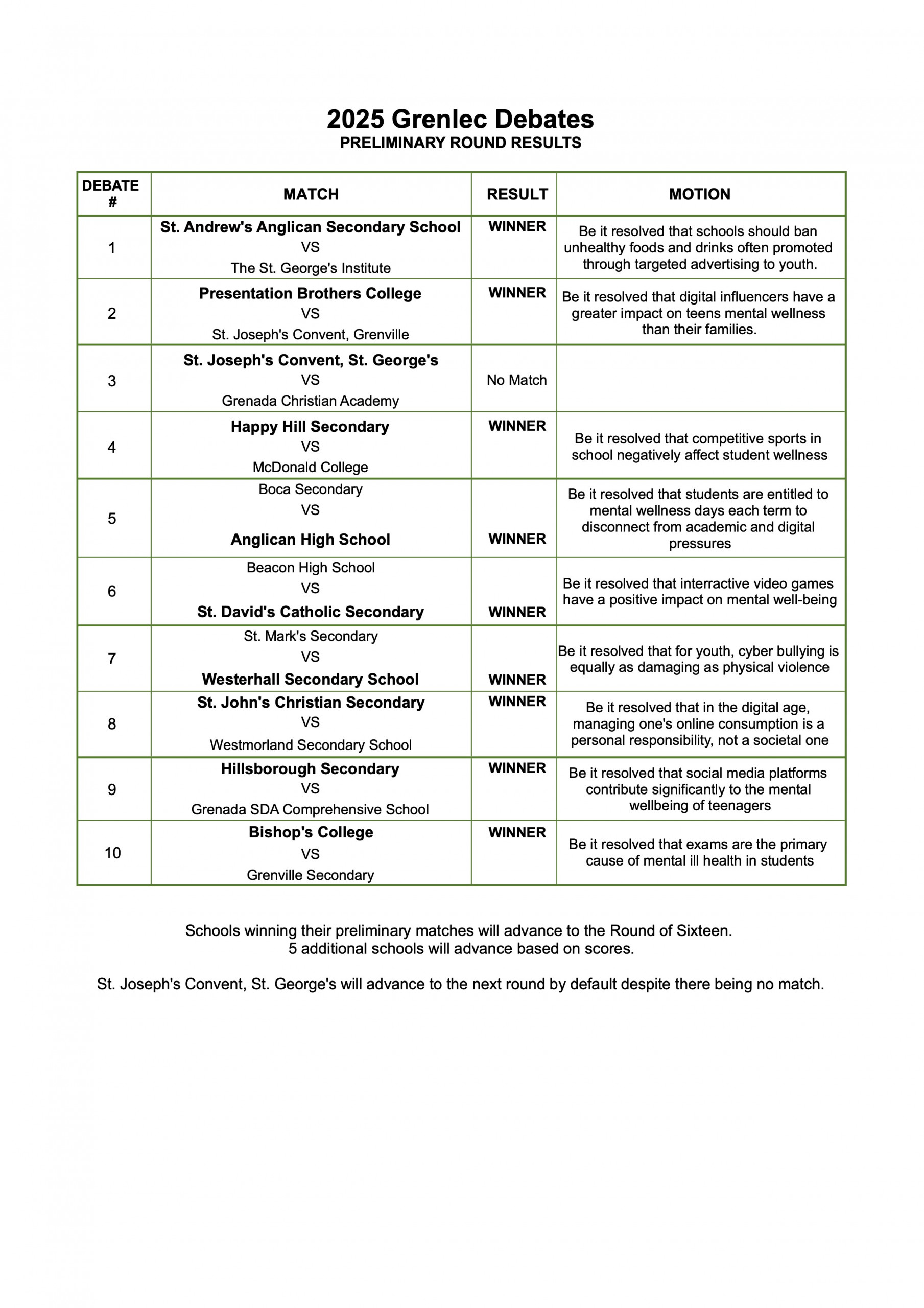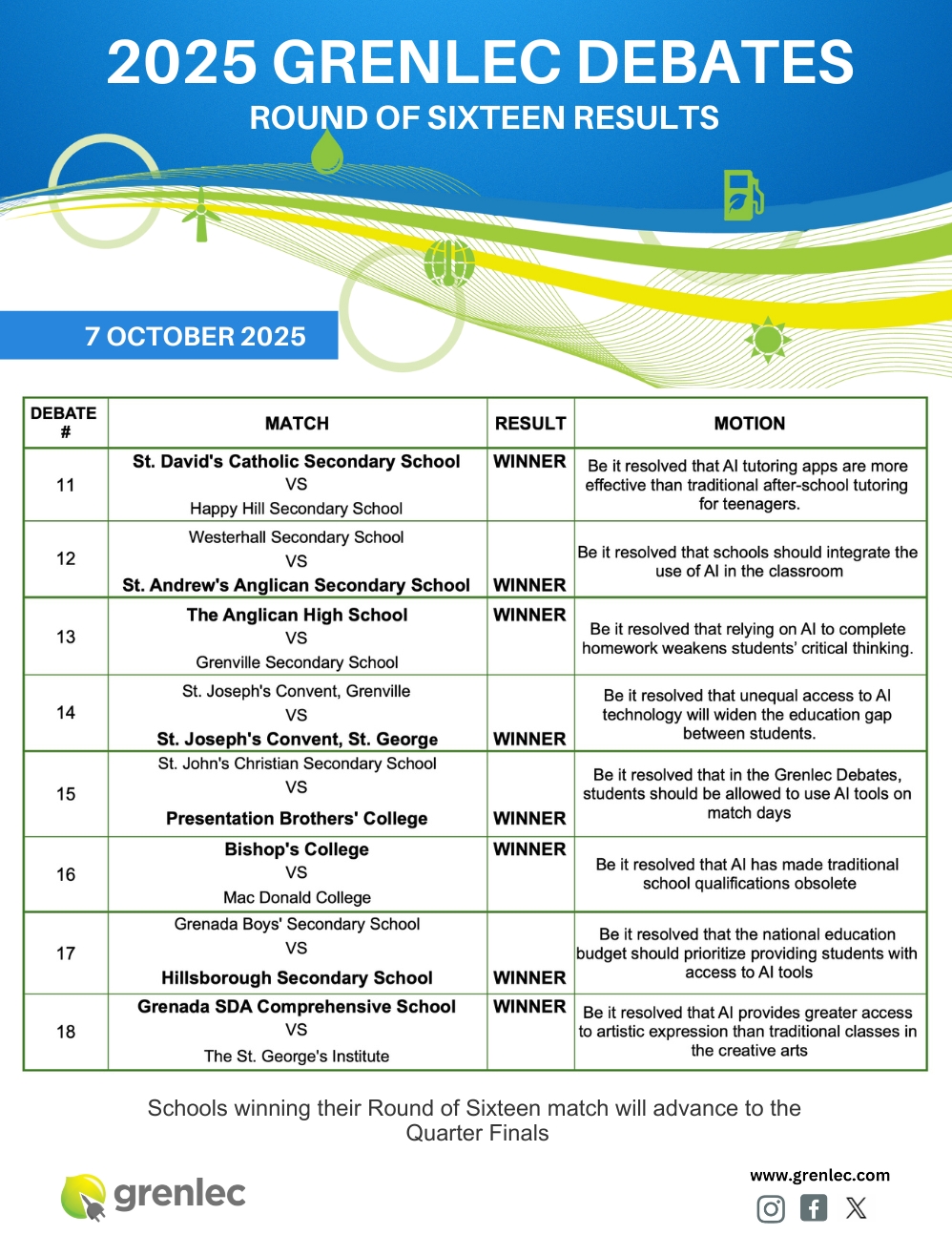 The 2025 Grenlec Debates are moving into high gear with 16 secondary schools moving to the Round of Sixteen following a strong preliminary showing. This year’s preliminaries, held under the theme “Mental Health and Wellness in the Digital Age,” showcased the depth of talent among Grenada’s students. Across three days of competition, debaters impressed with